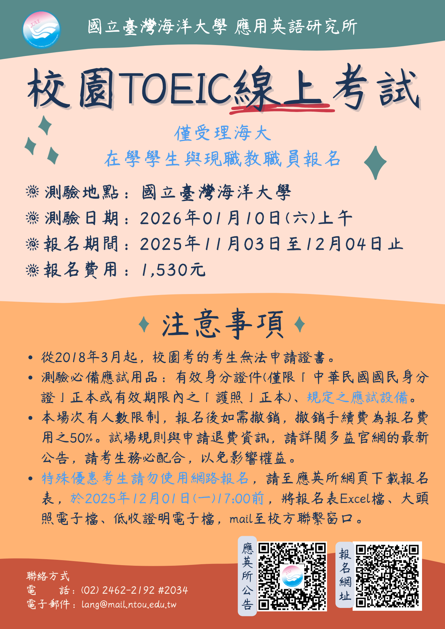 請於114年12月01日(一)17:00前,檢具相關文件,mail至校方聯繫窗口(lang@mail.ntou.edu.tw)。