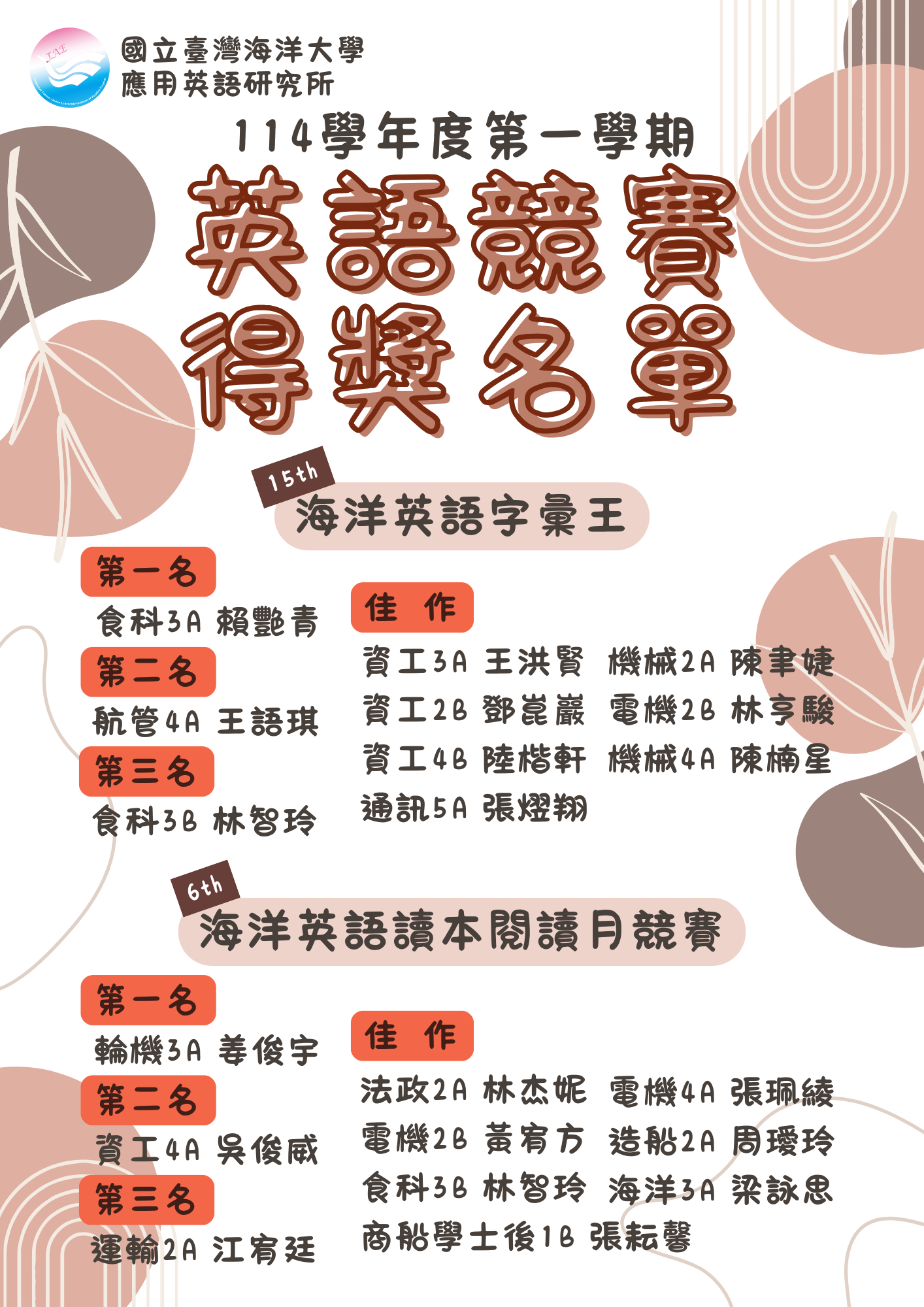 114學年度第一學期英語競賽得獎名單《頒獎典禮公告》