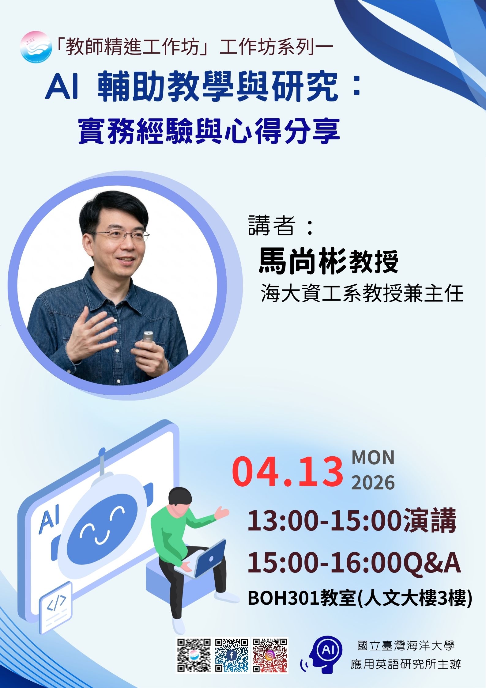 (一)演講題目:AI 輔助教學與研究:實務經驗與心得分享